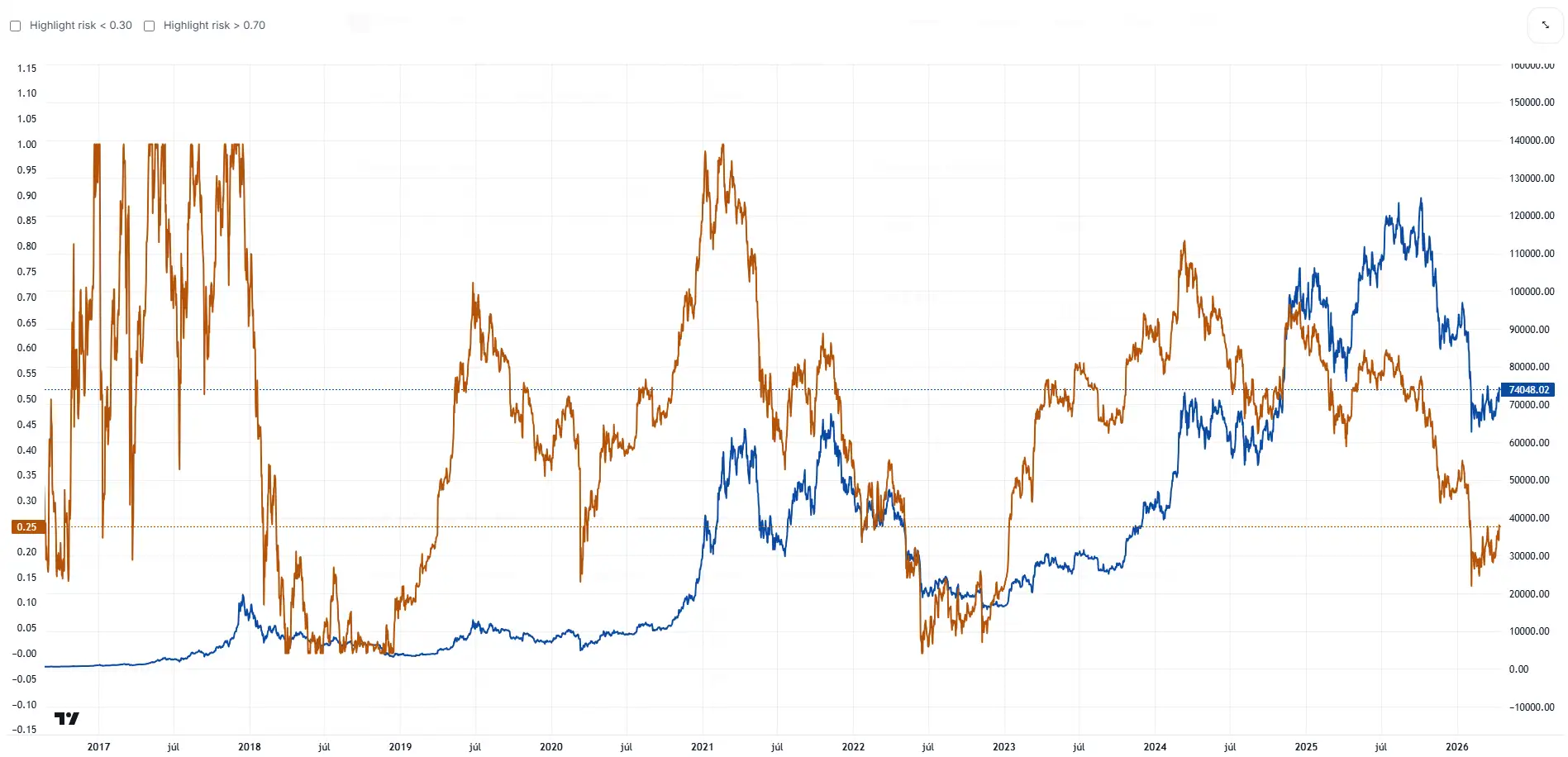 Tento súbor údajov vznikol preto, aby odpovedal na otázku, kde sa táto kryptomena nachádza v rámci svojho vlastného historického kontextu. Je dôležité si uvedomiť, že rovnaká cena môže predstavovať úplne odlišné podmienky v závislosti od pozície v cykle. Historické úrovne rizika pomáhajú porovnávať dnešný kontext s minulými fázami. Riziko sa vždy vzťahuje na konkrétny časový rámec, pričom tento konkrétny súbor údajov využíva denný rámec.