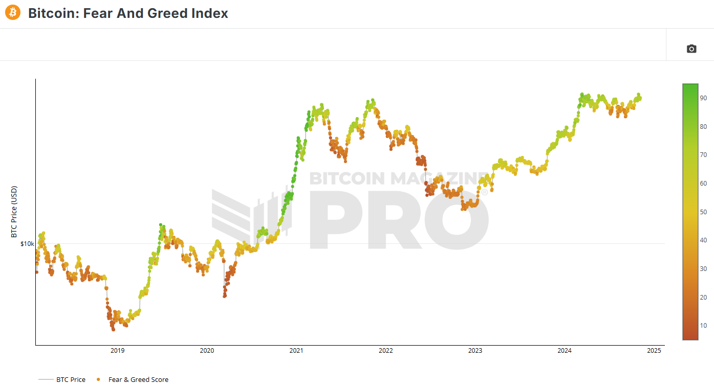 Do tretice si definujeme, aký je momentálny sentiment na trhu s Bitcoinom. Napriek tomu, že najväčšia kryptomena dosiahla historické maximum 75 000 dolárov, na trhu nevidíme prehnanú chamtivosť (tmavo zelená). Index strachu a chamtivosti od spoločnosti Bitcoin Magazine Pro signalizuje stabilný sentiment. Naposledy sme prehnanú chamtivosť sledovali na začiatku roku 2021, kedy Bitcoin formoval vrchol cyklu.