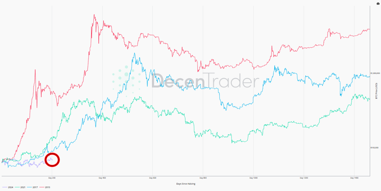 Ešte lepší pohľad na to, čo môže dokázať Bitcoin najbližšie mesiace, nám ukazuje graf od DecenTrader. V červenom kruhu môžete vidieť, kde sa nachádza cena Bitcoinu v tomto cykle. Teraz si to porovnajte s predošlými cyklami. Graf zobrazuje výkonnosť Bitcoinu od halvingu po ďalší halving. Jednoznačne vidíme, že vždy po tejto udalosti nastal exponenciálny vzostup.