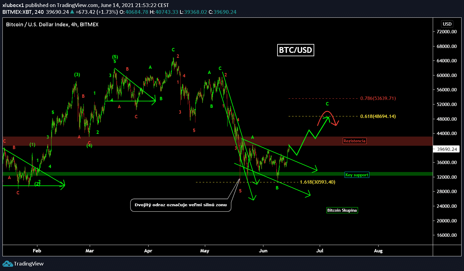 Aktuálne sme s veľkou pravdepodobnosťou na konci korekcie a je tu náznak tvorby guľatého dna. Dokonca po dlhšej dobe sme našli už aj nové high a zároveň vypadli von z bearish kanála. Jediný problém, ktorý sa dal očakávať je práve so zlomením rezistencie na 40 000 USD. Keď ale vidíme ako sú nakupujúci pri sile, tak ani tá nemusí donekonečna odolávať.