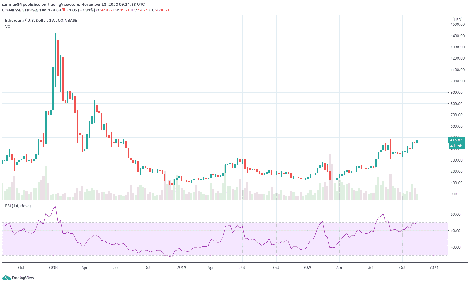 Aby sa Bitcoin zo svojho dna 3200 $ dostal na historické maximu, musel zvýšiť svoju hodnotu „iba“ 6,5-krát (650%). Aby sa Ethereum zo dna 80 $ dostalo na historických 1400 $, musí spraviť 1750% zisk. Aktuálne sa obchoduje za 480 $, čo zodpovedá 600% zisku.