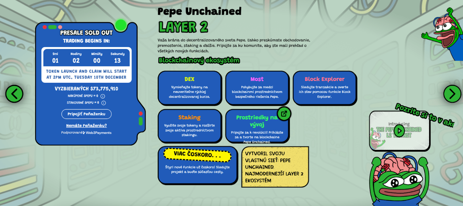 Čo stojí za úspechom projektu?Pepe Unchained prináša inovatívny ekosystém s vlastnou druhou vrstvou nazvanou Pepe Chain. Tá umožňuje transakcie až 100-krát rýchlejšie než na Ethereum blockchaine a za zlomkové poplatky.