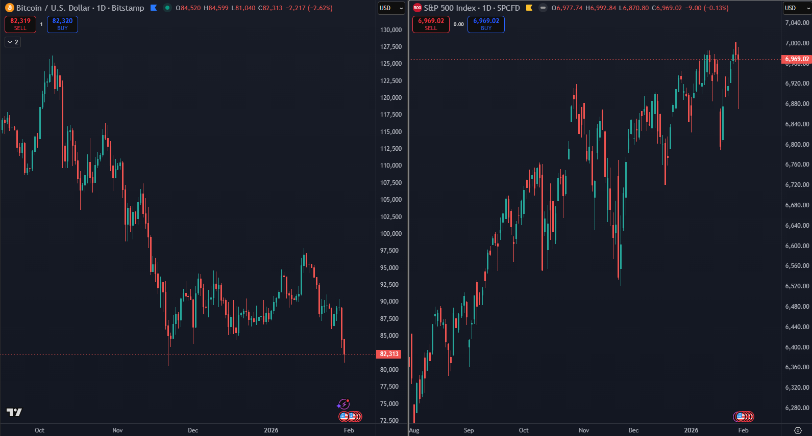 Kryptomena pravdepodobne bude naďalej strácať voči akciovému trhu, zatiaľ čo očakávania masívnej rotácie zo zlata a striebra do krypta sa javia ako chybné. Podľa údajov TradingView ceny zlata a striebra nedávno vzrástli na historické maximá 5 598 dolára a 121 dolára.