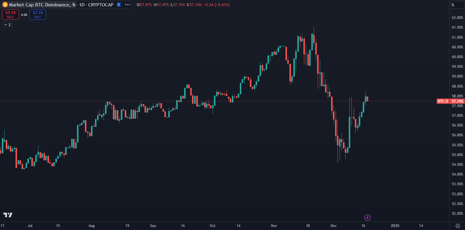 Zatiaľ čo Bitcoin stúpa na nové maximá, mnohé altcoiny nestíhajú držať krok. Výsledkom je opätovný vzostup dominancie BTC, ukazujú údaje TradingView. Po tom, čo sme boli svedkami nárastu cien altcoinov, nastalo obdobie ich poklesu, keďže dominancia BTC stúpla za posledné dva týždne o 3,70 % na úroveň takmer 58 %.
