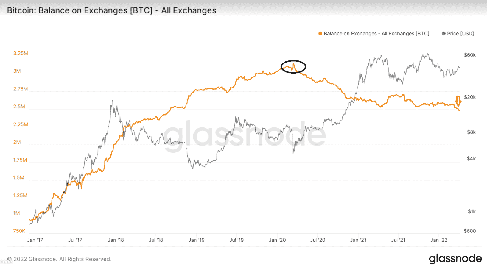 Bitcoin držaný na burzových peňaženkách klesá od marca 2020 (čierny kruh na grafe nižšie). Vtedy bolo na burzových adresách držaných celkovo 3 118 057 mincí. Táto hodnota stále predstavuje historické maximum.