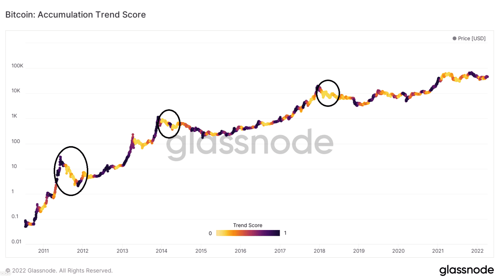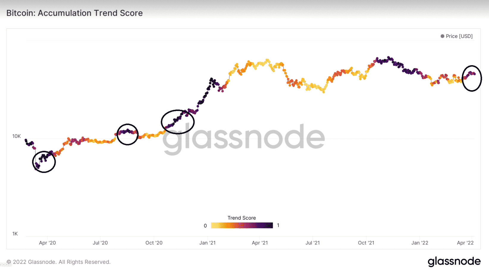 Skóre trendu akumulácie. Zdroj: Glassnode