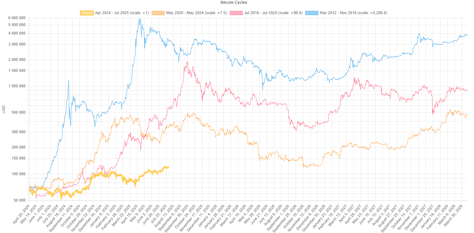 Podľa údajov BitcoinCyclesComparison je každý bitcoinový cyklus menej ziskový. V súčasnosti sledujeme zhodnotenie okolo 700 %, pričom v minulom cykle to bolo 1 900 %, predtým 9 700 % a ešte predtým 58 000 %. Kým predchádzajúce rozdiely boli 5 až 6-násobné, teraz ide len o 2,5-násobný pokles, čo poukazuje na stabilizujúci sa rast Bitcoinu.