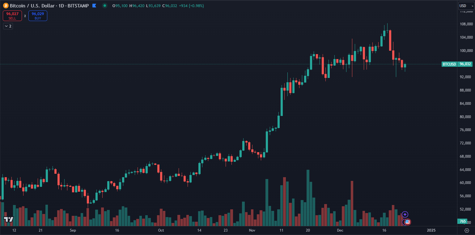 Bitcoin dosiahol 108 000 dolárov. Zdroj: TradingView