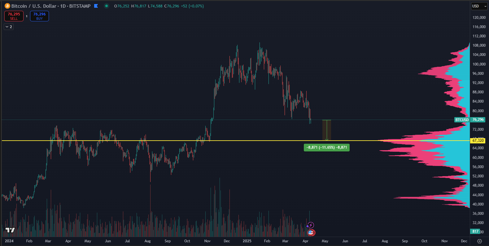 Očakávaný pokles až o 10 000 dolárov by znamenal návrat na hladinu okolo 67 000 dolárov, ktorá sa javí ako realistický cieľ v prípade ďalšieho prepadu. Tento scenár je podporený tým, že zóna medzi 67 320 a 63 300 dolármi patrí k najviac obchodovaným úrovniam od roku 2024. Odborne sa tejto úrovni hovorí bod kontroly (Point of Control).