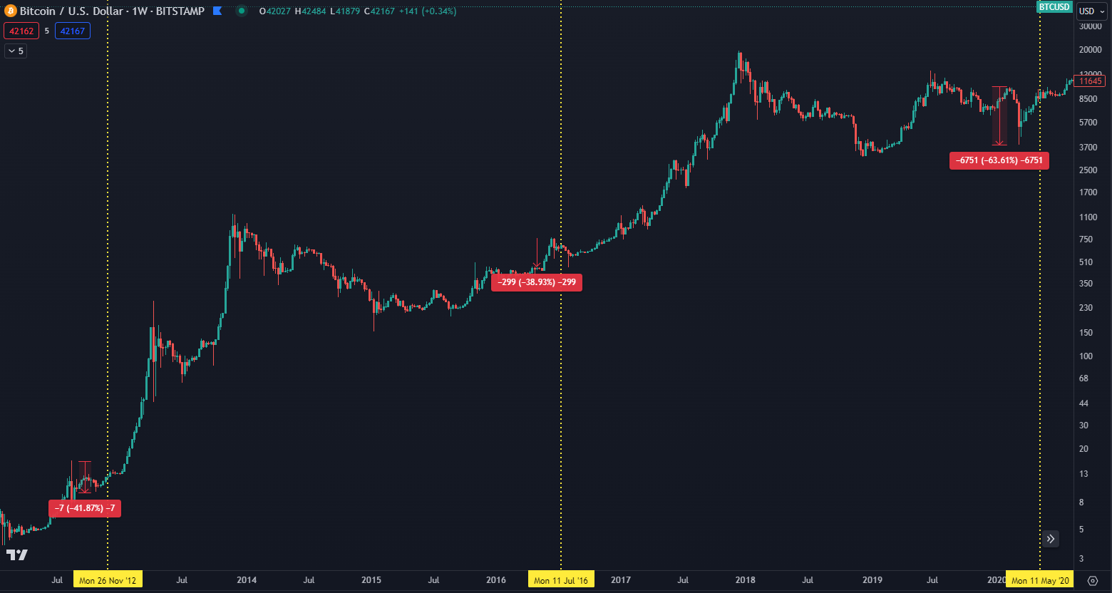 Na základe historických pohybov by cenový prepad pred halvingom nebol žiadnou novinkou. Dokonca môžeme povedať, že je to pravidlom. Na grafe nižšie vidíme, ako Bitcoin vždy počas tejto udalosti alebo tesne pred ňou klesol. Hovoríme o korekciách, ktoré dosahovali 30 až 60 %. Tá najsilnejšia ale bola spôsobená aj covid pandémiou. Nič to však nemení na rovnakom správaní trhu.