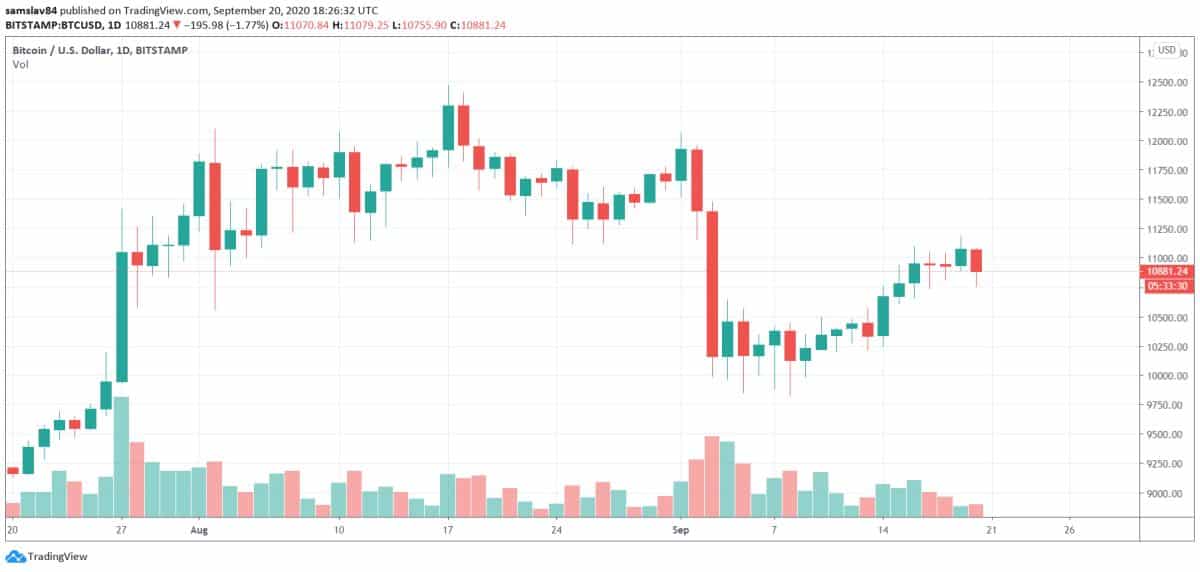 Bitcoin včera (sobota) uzavrel daily sviecu na hornej hrane intervalu 10 800 – 11 200 $, no počas nedeľnej trading session sa prepadol o tri stovky nižšie, kde sa obchoduje aj v čase písania tohto článku.