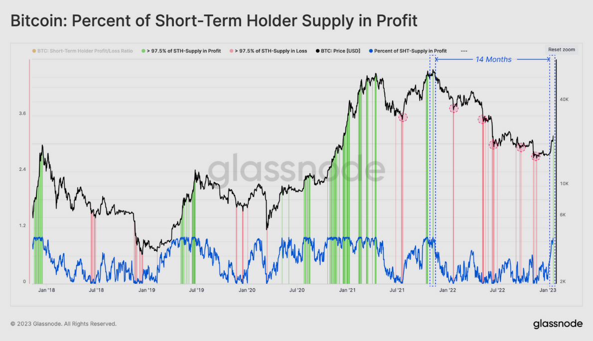 Metrika krátkodobých držiteľov v zisku hovorí o tom či je trh z krátkodobého hľadiska presýtený ziskami alebo stratami. Hovorí iba o vlastníkoch bitcoinu, ktorí ho držia menej ako 155 dní. Ako môžeme vidieť na grafe nižšie, takmer každý krátkodobý držiteľ je v zisku a modrá krivka je blízko hodnoty 100 %.