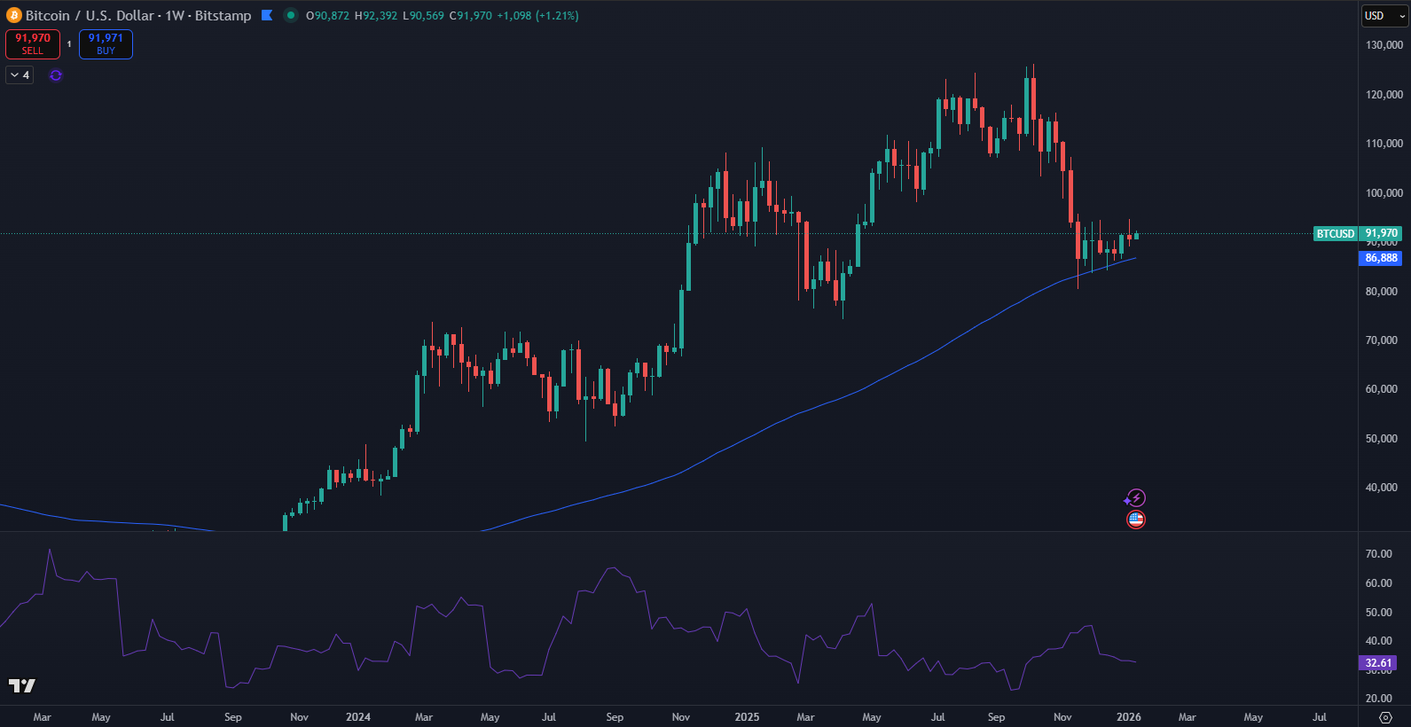 Kombinácia pohybu okolo 100-týždňového priemeru a extrémne nízkej volatility určí hlavný trend pre rok 2026. Tento pohľad naznačuje, že pokoj na trhu môže predstavovať skôr pascu než signál stability.