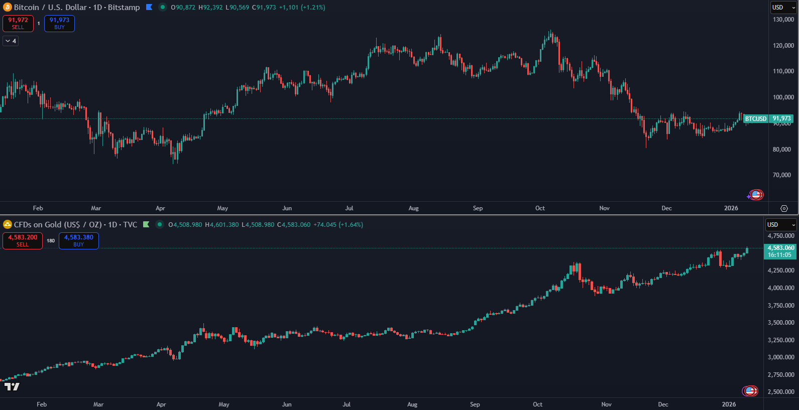 - Divergencia medzi zlatom a Bitcoinom naznačuje tlak na rizikové aktíva.