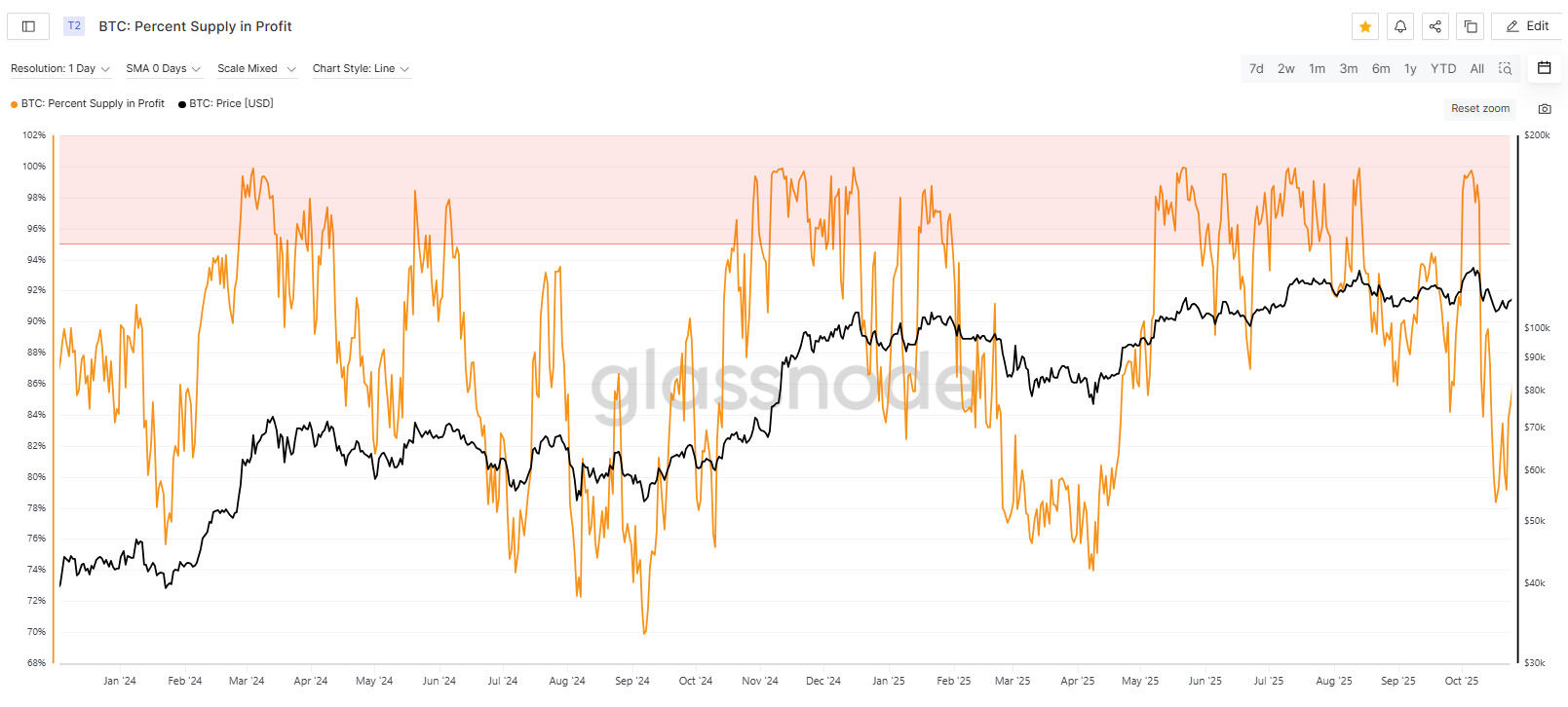 Obchodovanie v blízkosti úrovne nákladov krátkodobých držiteľov zvyčajne naznačuje, že trh sa nachádza na rozcestí. Po dosiahnutí nového historického maxima, sa percento ponuky v zisku prepadlo približne na 83,78 %, čo znamená, že viac než 15 % všetkých Bitcoinov sa obchoduje so stratou.