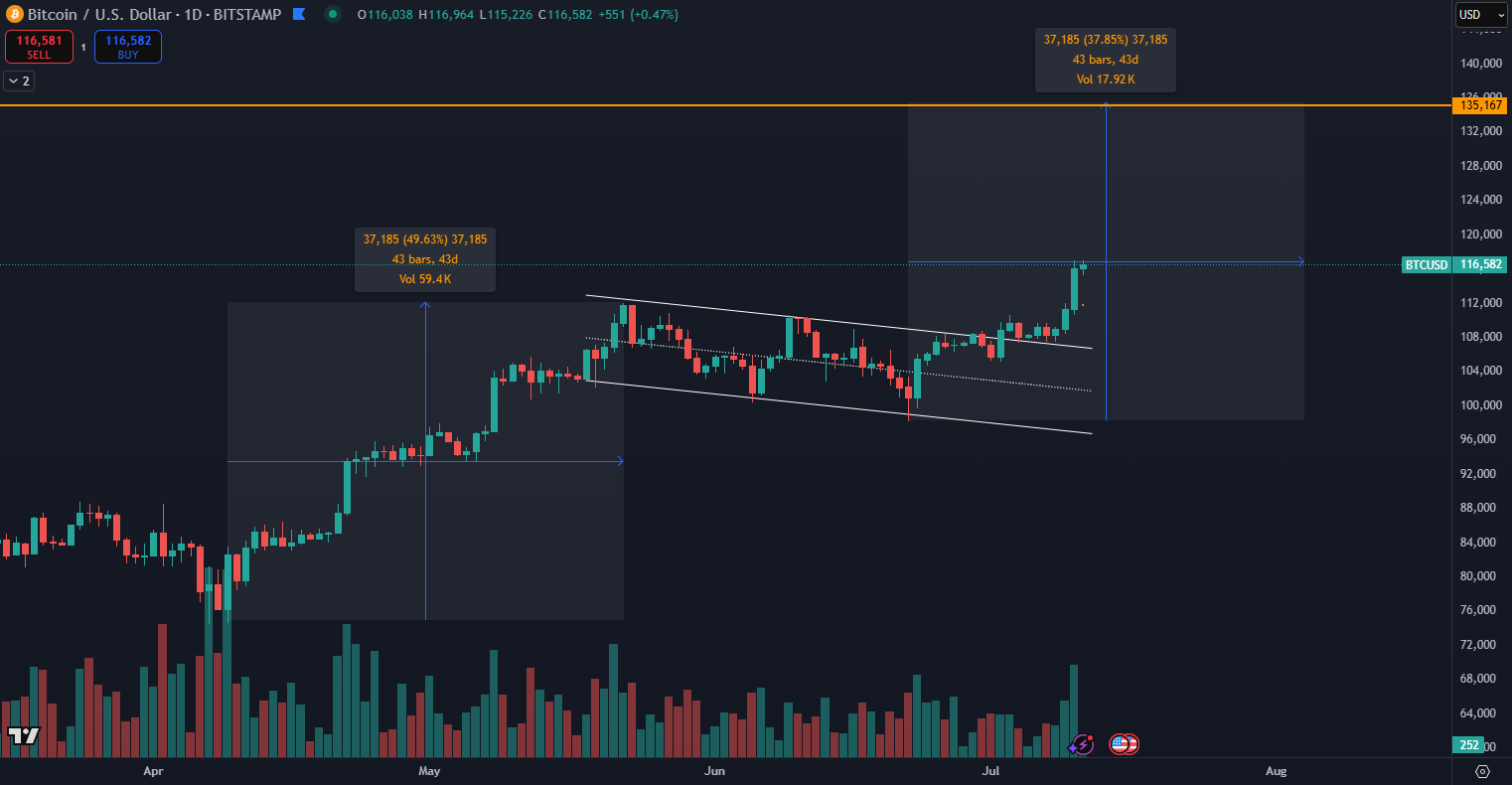 Vzhľadom na kombináciu rastového momenta a klesajúcich objemov by nebolo prekvapením, ak by Bitcoin budúci týždeň dosiahol 120 000 dolárov. Nie je jasné, kam až sa dostaneme počas leta, ale záujem jasne prevyšuje ponuku, čo jasne naznačuje optimistický výhľad obchodníkov.