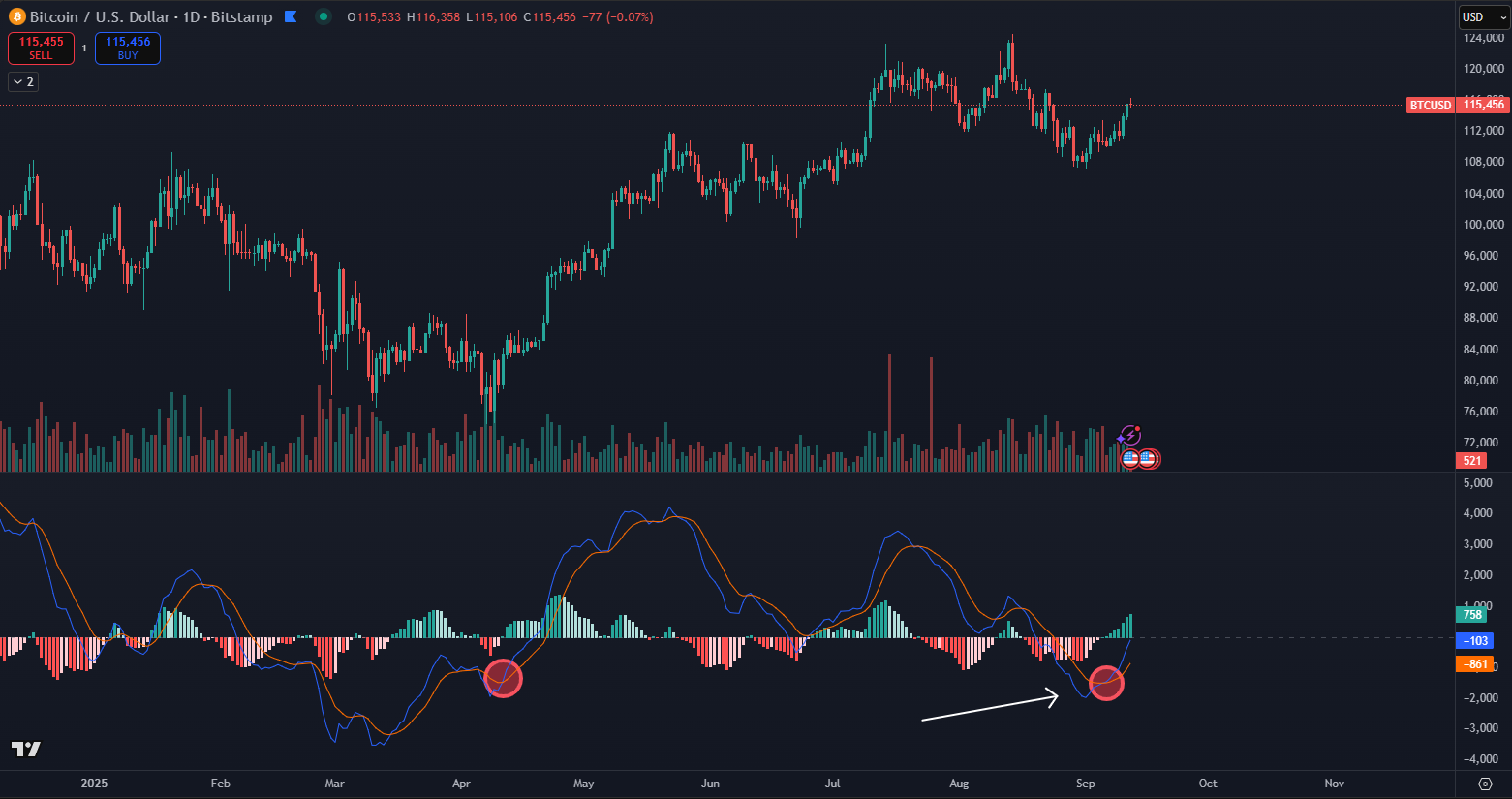 Bitcoin aktuálne vykazuje podľa magazínu Finbold jasné známky, že jeho krátkodobá dynamika sa môže udržať a potenciálne nasmerovať cenu k novému rekordu. Kryptomenový analytik BitBull poukázal na formovanie indikátora MACD „golden cross” pod nulovou líniou. Tento jav sa v minulosti spájal s prudkými rastami. Naposledy sa objavil v apríli, keď Bitcoin vzrástol približne o 42 % v priebehu mesiaca a dosiahol historické maximum.