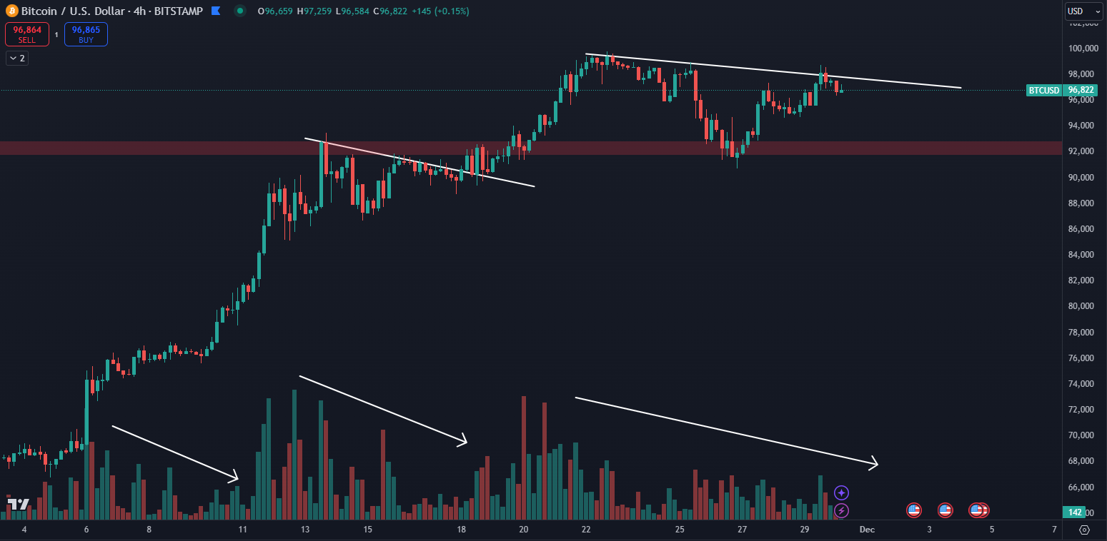 Všimnite si, že medzi 13. a 18. novembrom Bitcoin formoval podobnú štruktúru, ktorá bola napokon prerazená smerom nahor. Ak sa história zopakuje, podobné prelomenie by mohlo nastať aj v najbližších dňoch. Zároveň pozorujeme klesajúce obchodné objemy, čo naznačuje, že Bitcoin sa pripravuje na volatilnejší pohyb.