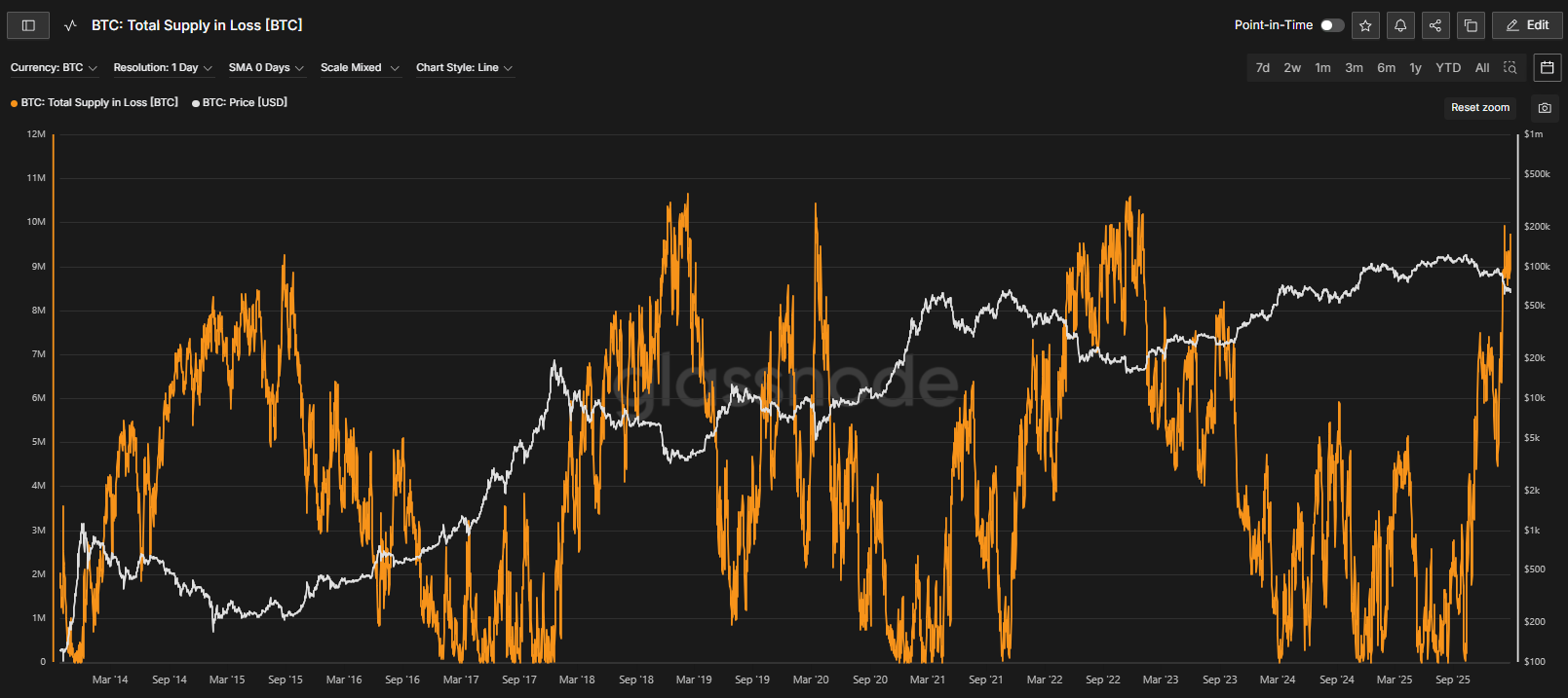 • Približne 9 miliónov BTC držia investori v strate, čo vytvára silný tlak na predaj.