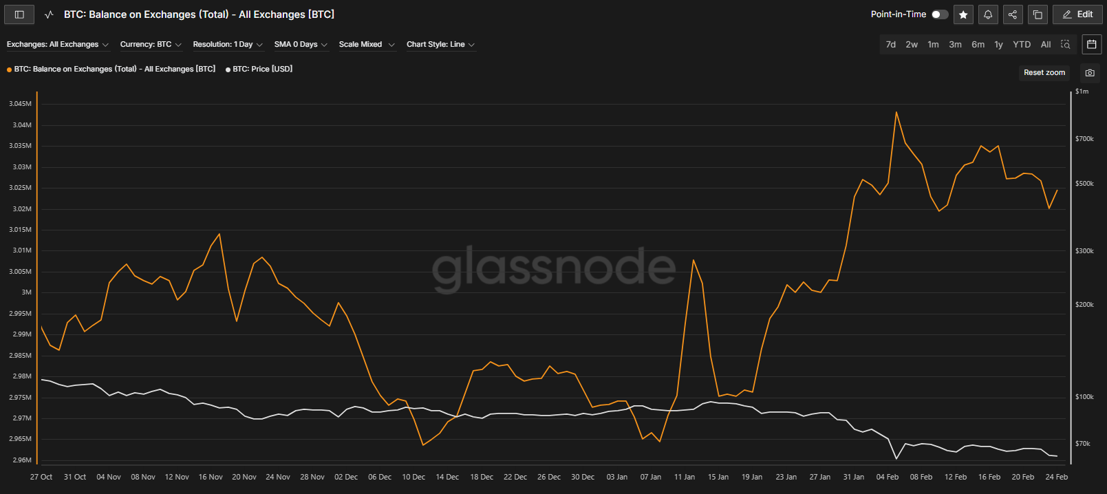 Vklady BTC na burzy rastú. Zdroj: glassnode.com