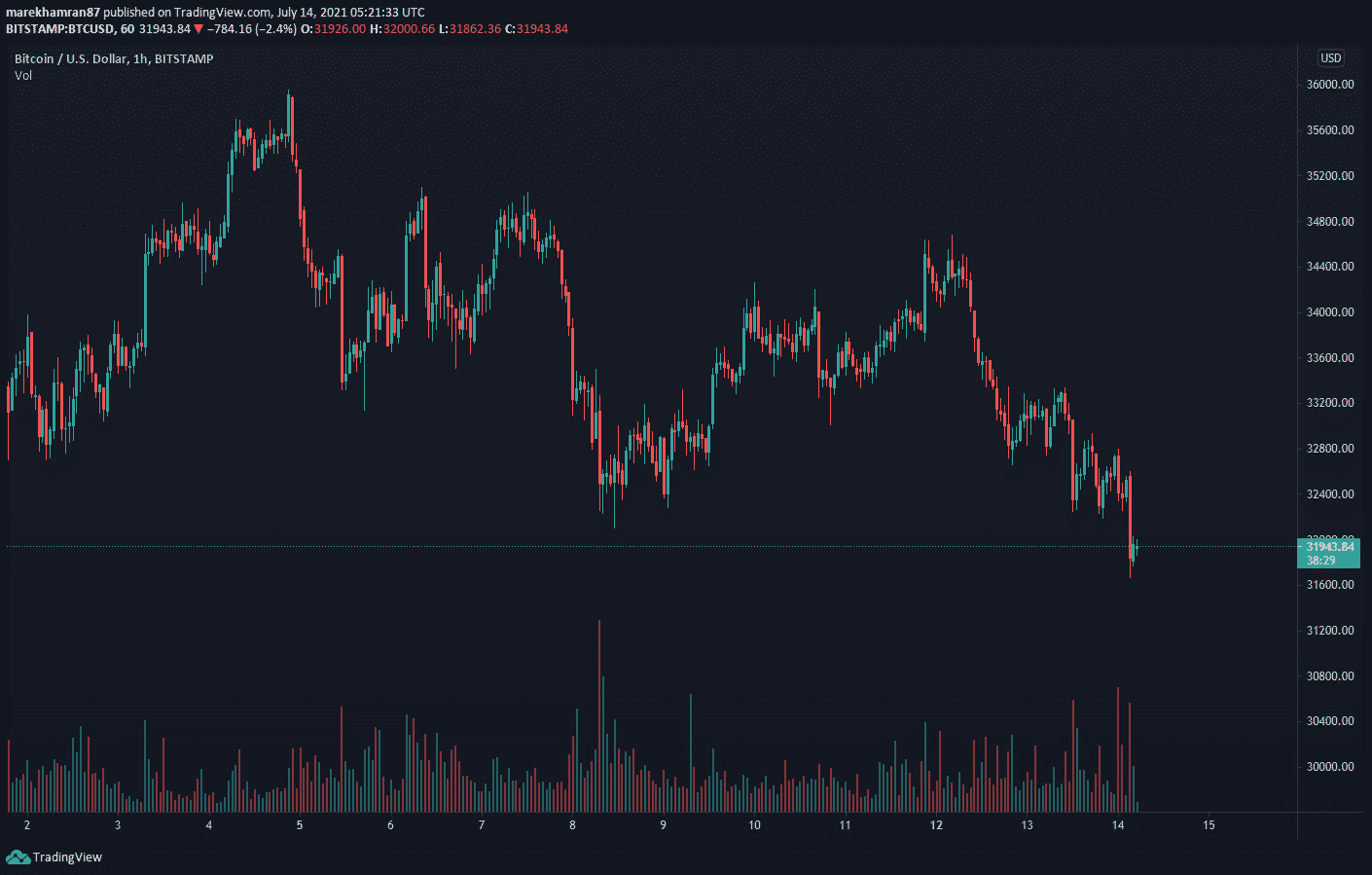 Snahy o vytvorenie supportu na cene 33 000 USD bol teda neúspešný, ale čo môžeme očakávať ďalej? V čase písania tohto článku sa Bitcoin pohyboval na úrovni 32 000 USD.