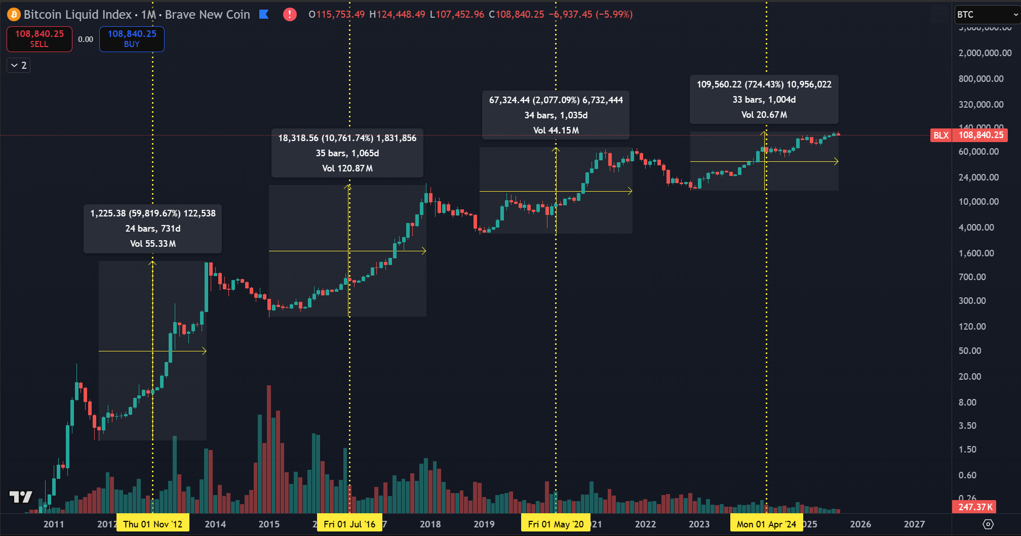 Rastúce obdobie trvalo od novembra 2022 do aprílového halvingu v roku 2024. Podľa historických paralel by sa rovnaká fáza mala odohrávať aj po halvingu, teda až do septembra 2025. To by znamenalo, že vrchol by mohol prísť na jeseň 2025, pričom následná korekcia by opäť dosiahla približne 80 %. Trhové dáta však naznačujú, že takýto prudký pokles nemusí nastať.