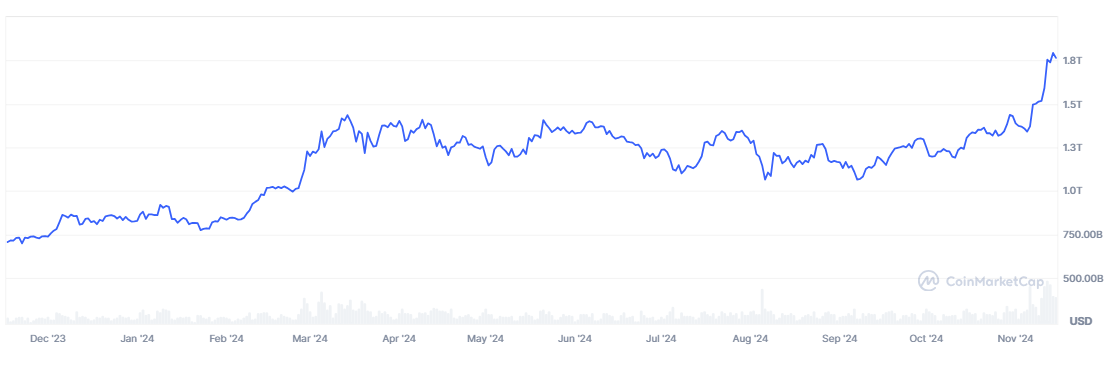 - Bitcoin dokázal prekonať trhovú kapitalizáciu 1,8 bilióna dolárov.