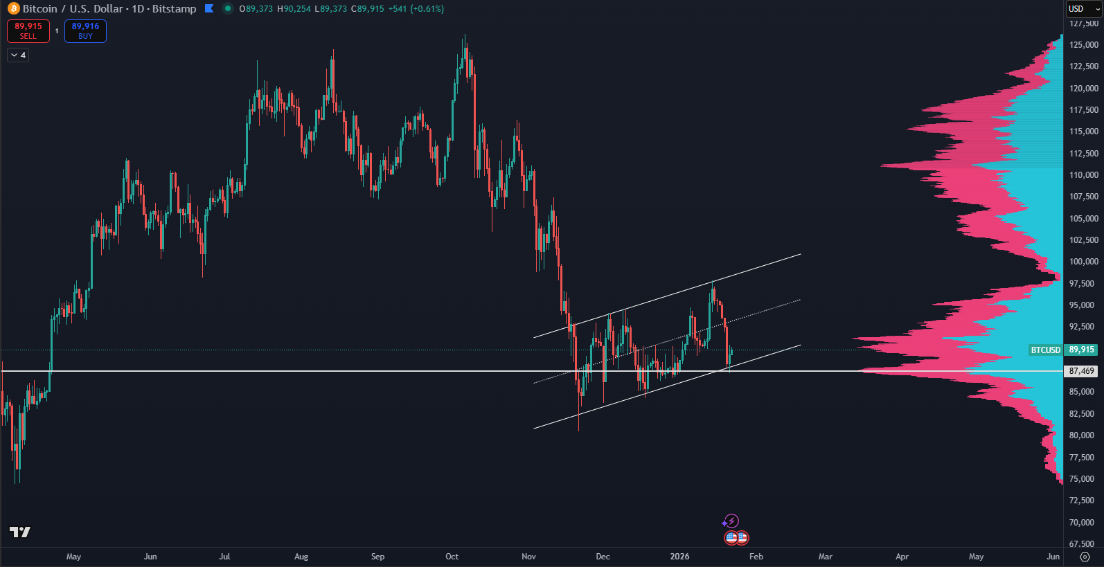 Bitcoin vstupuje do ďalšej fázy dlhodobej korekcie, ktorú detailne sledujeme na analytickom portáli TradingView. Aktuálna technická štruktúra naznačuje, že trh zatiaľ rešpektuje rastúcu vlajku, ktorá sa formuje už od novembra 2025.