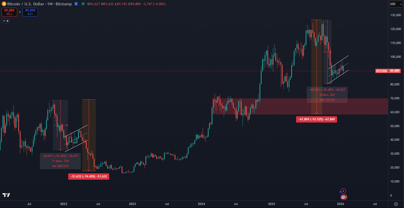 Pri porovnaní s predchádzajúcim trhovým cyklom zaujme výrazná podobnosť cenového správania. Po vytvorení vrcholu cyklu prišla masívna korekcia. V roku 2026 dosiahla korekcia približne 36 %, zatiaľ čo v roku 2022 trh zaznamenal pokles o 53 %. Následne sa v oboch prípadoch vytvorila rastúca vlajka, v ktorej Bitcoin zotrváva aj dnes.