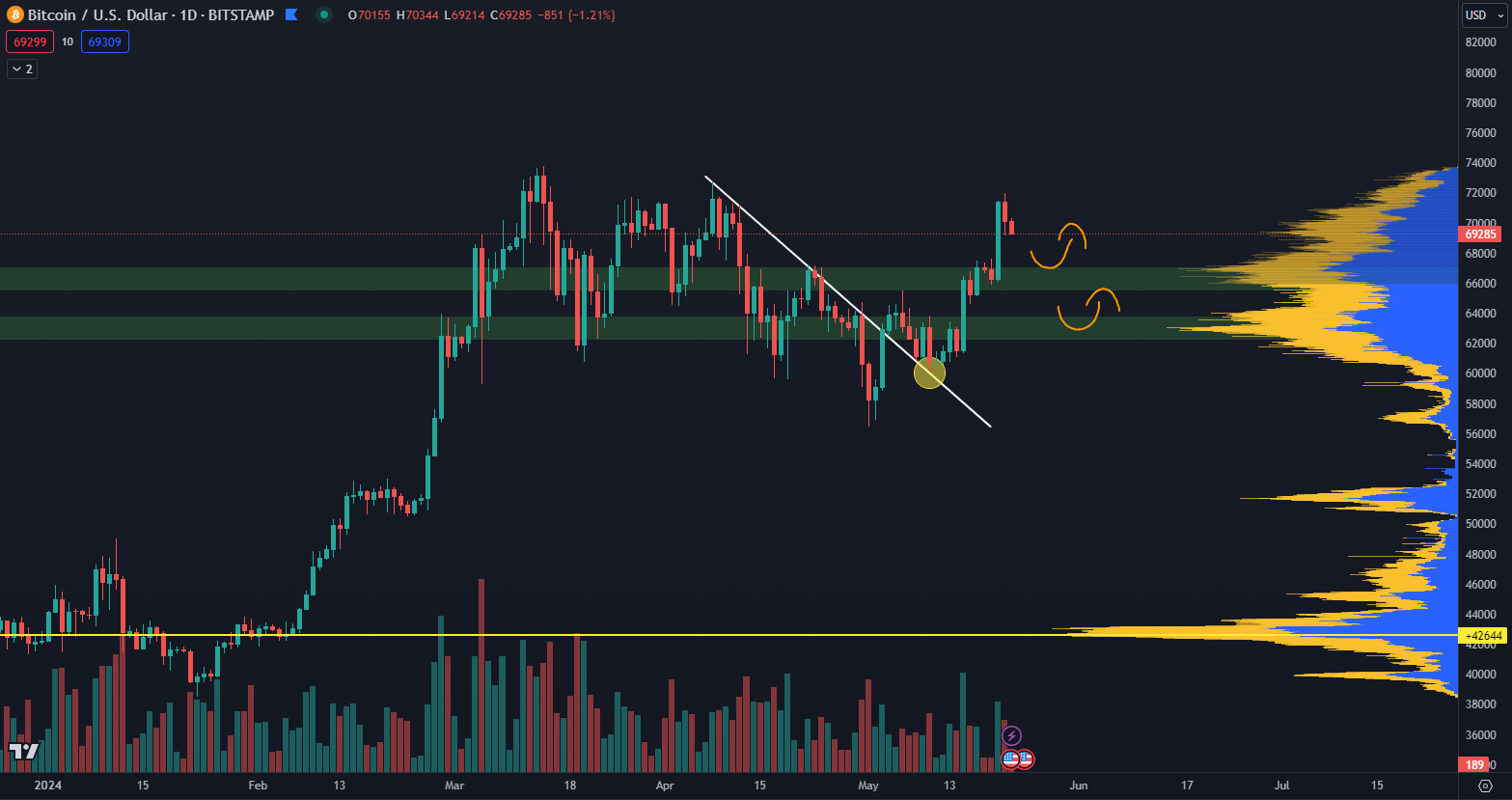Bitcoin 20. mája dokázal opäť prekonať magickú hranicu 70 000 dolárov. Len deň na to sa sformovalo ďalšie krátkodobé lokálne maximum 71 958 dolárov a odvtedy cena mierne klesá. Zdá sa, že májový vzostup najväčšej kryptomeny na svete definitívne ukončil negatívny sentiment a korekciu.