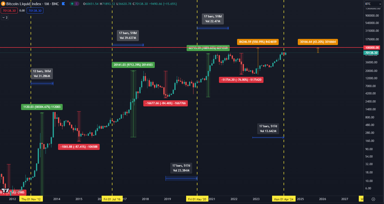 Od ceny 70 000 dolárov by Bitcoin musel stúpnuť ešte o 43 %, aby kontaktoval hranicu 100 000 dolárov. Od novembrového minima z roku 2022 (najnižší bod súčasného cyklu) by celkové zhodnotenie predstavovalo 550 %. Len pre porovnanie, predošlý cyklus dosiahol zhodnotenie 1 900 % a ten pred ním 10 000 %.