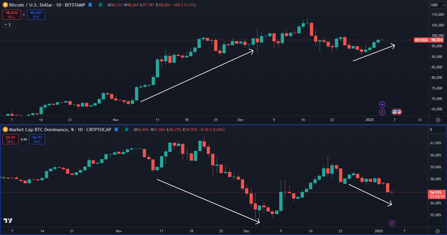 Bitcoin sa opäť dostal do zaujímavej situácie, v ktorej trhová cena stúpa, no dominancia kryptomeny je na ústupe. V tomto článku si vysvetlíme, čo to znamená a ako to môžu obchodníci využiť vo svoj prospech. Mnohé altcoiny začali totiž podľa údajov TradingView prudko rásť.