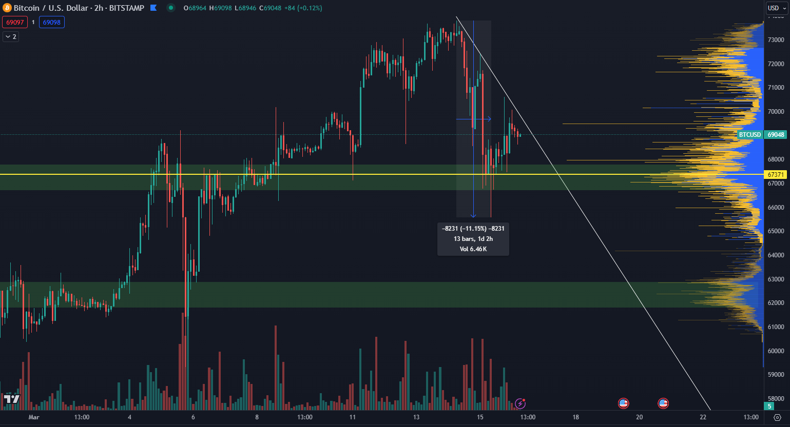 Bitcoin klesol na prelome 14. a 15. marca z maxima 73 800 dolárov na 65 570 dolárov. Podľa správy Decrypt bol hlavným dôvodom presun mincí v hodnote až 400 miliónov dolárov zo strany spoločnosti Grayscale na burzu Coinbase. Tieto výbery pokračujú až dodnes. Všeobecne presuny na burzu znamenajú následný predaj.