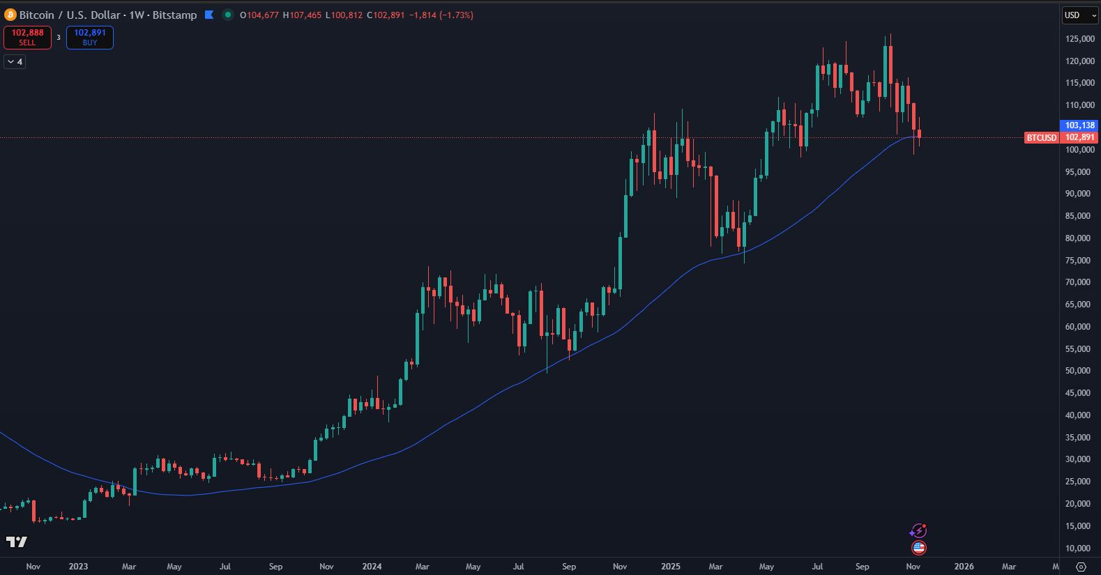 Na týždennej časovej osi je pokles Bitcoinu len 0,37 %, zatiaľ čo denný pokles je takmer 2 %. Cena sa aktuálne nachádza pod 50-dňovým kĺzavým priemerom 103 139 dolárov, čo potvrdzuje krátkodobú predajnú kontrolu a pokračujúci trend poklesu od polovice októbra.