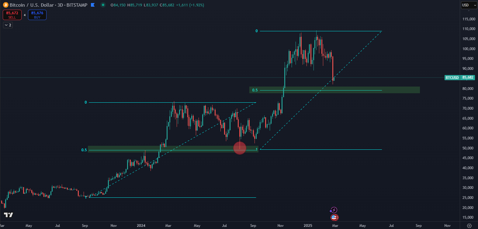 Na grafe môžeme vidieť, že súčasná cenová aktivita presne odráža aktivitu z roku 2024, kedy silný rast prešiel do korekčnej fázy. Mnohí investori vnímajú tieto podobnosti ako signál pre svoje obchodné rozhodnutia. Taktiež BITmarkets identifikoval kľúčovú zónu podpory okolo 80 000 dolárov, ktorá ešte musí byť otestovaná a vyrovnaná cenovou akciou (zelená zóna).