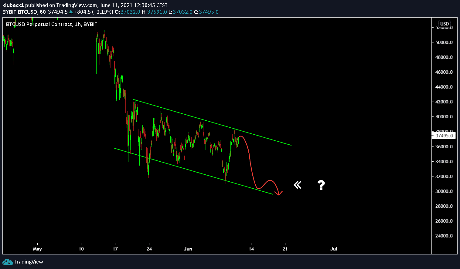 Ako vidno na obrázku vyššie, tak sme na vrchnej hrane kanála. Ak by táto analýza bola platná, tak Bitcoin môže spadnúť ešte minimálne raz. A to dokonca na 28 000 USD. Aktuálne sa držíme iba tesne pod vrchnou čiarou tohto patternu a samozrejme nemôžeme vylúčiť ani bullish break out, ktorým by s veľkou pravdepodobnosťou bolo po bearish trende a Bitcoin by mal mať otvorenú cestu napríklad aj na nové ATH. Rozhodnúť sa môže už v blízkej budúcnosti.