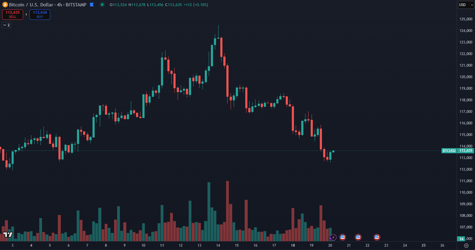 Bitcoin (BTC) po nedávnom vzostupe nad hranicu 124 000 dolárov zaznamenal ochladenie, keď sa cena prepadla na hranicu okolo 112 600 dolárov. Podľa údajov TradingView ide o pokles približne 7 % oproti maximám spred niekoľkých týždňov. Tento vývoj nie je náhodným javom, keďže celý kryptotrh zápasí so súhrou faktorov, medzi ktoré patrí vyberanie ziskov, masívne likvidácie a neistota ohľadom politiky amerického Fedu.