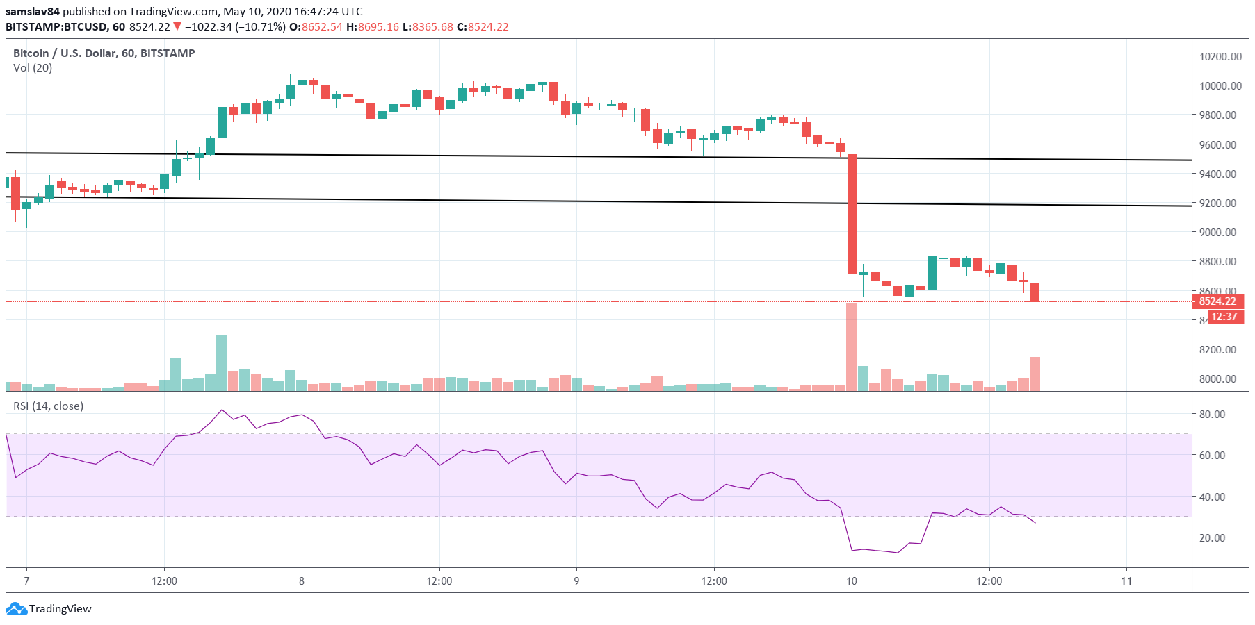 Bitcoin dnes (ne)prekvapil predhalvingovým dumpom na 8110 $ (Binance) a zdá sa, že bude chvíľu trvať, než sa z tohto prudkého pohybu spamätá. V jeho neprospech na krátkodobom horizonte hralo niekoľko faktorov. Jedným z nich bola aj RSI divergencia na 4h timeframe. Tento prepad sme správne predikovali ešte vo štvrtok v našej analýze.