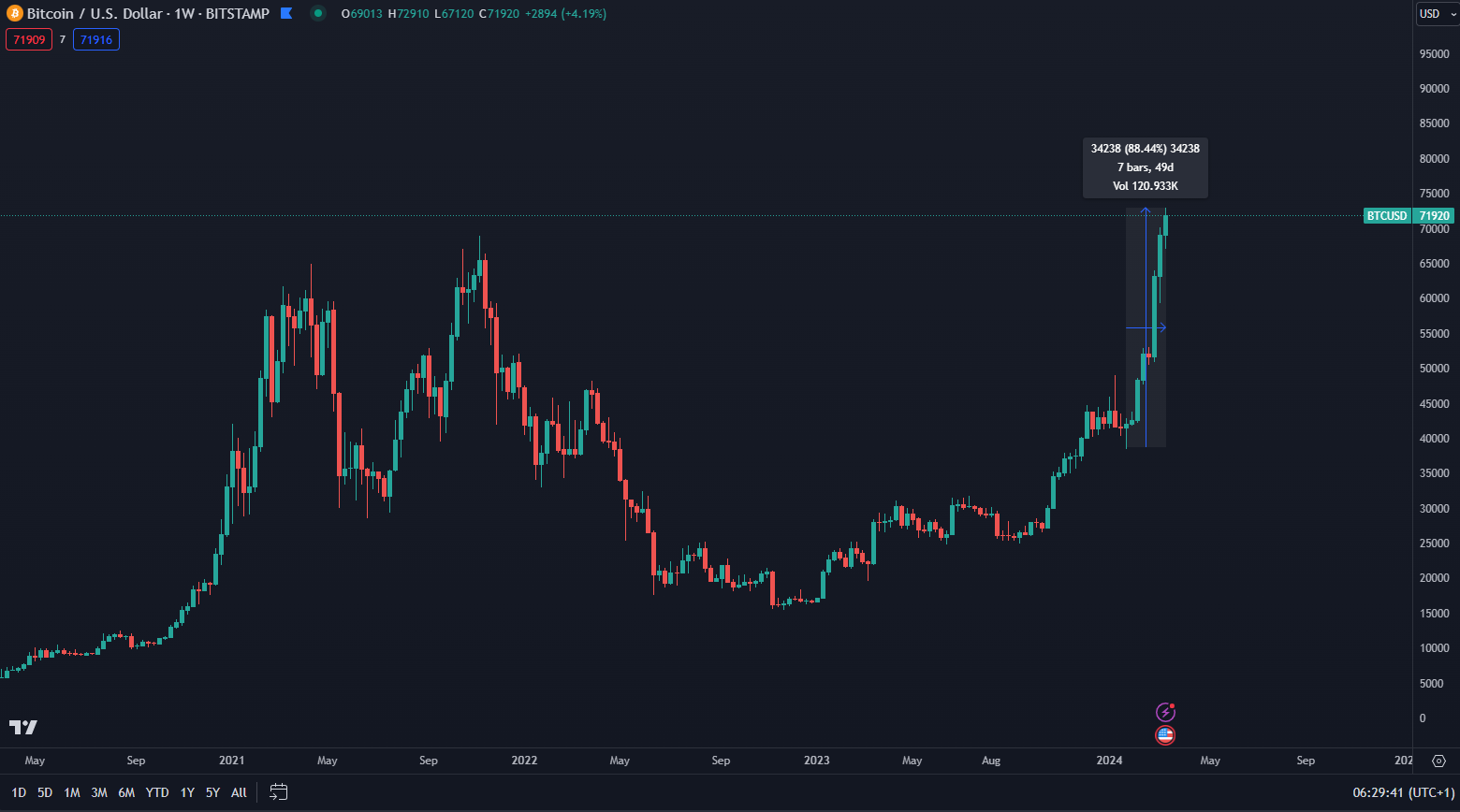 V poslednom kvartáli 2023 vstúpil Bitcoin do fázy bullrunu a ukončil akumuláciu. O pár mesiacov neskôr došlo k prekonaniu historického maxima, a to aj napriek tomu, že do halvingu máme stále približne mesiac. Bitcoin vždy v minulosti prekonával maximum až niekoľko mesiacov po halvingu.