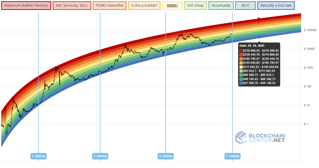 Pri určovaní potenciálneho vrcholu cyklu nám pomôže logaritmický graf Bitcoinu, kde pozorujeme percentuálne zmeny a nie absolútne. Dúhový graf nám identifikuje, v akej fáze sa trh nachádza, pričom každý cyklus je o jednu fázu menej ziskový. Takže podľa tejto kalkulácie by sa mal vrchol vytvoriť niekde medzi 3. a 4. fázou zhora.