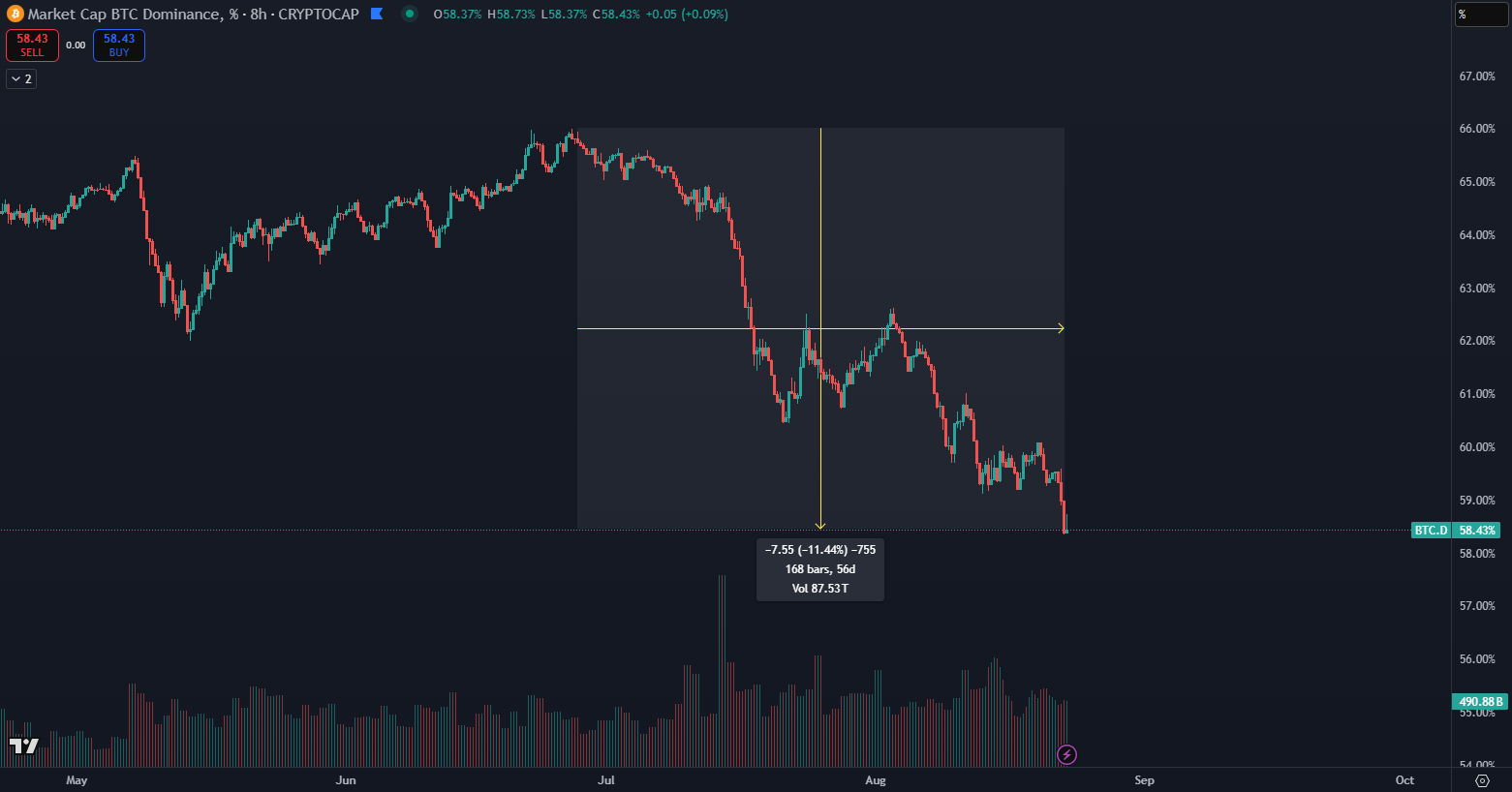 Okrem samotného prudkého pohybu ceny je potrebné sledovať aj vývoj dominancie Bitcoinu. Tá totiž za posledné dva mesiace výrazne klesla. Došlo celkovo k zníženiu už o 11,50 %, čo predstavuje najväčší pokles v rámci aktuálneho cyklu za posledné 3 roky. Dokonca tým prekonala aj novembrovú korekciu z roku 2024, ktorá bola dovtedy považovaná za jednu z najvýznamnejších.