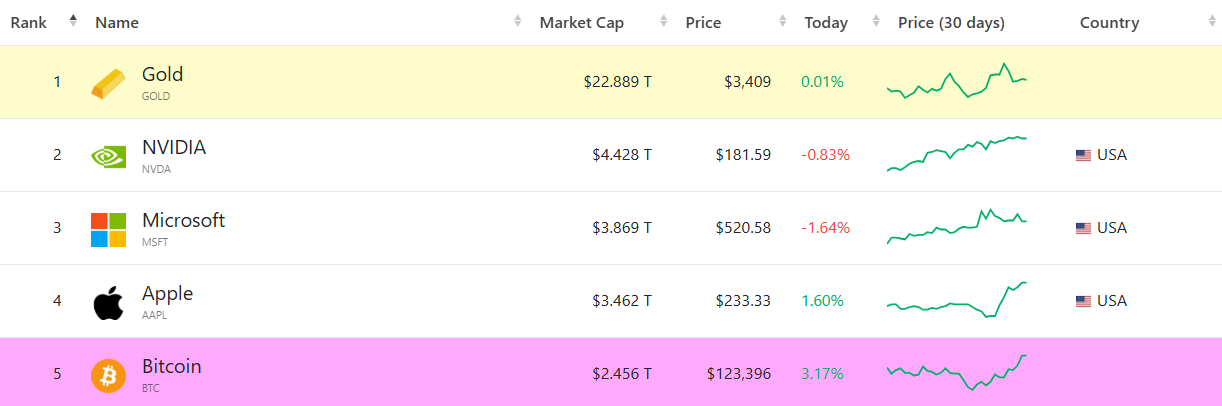 Bitcoin dosiahol nové historické maximum, keď jeho cena vystúpila na 124 500 dolárov za mincu, ukazujú údaje TradingView. Týmto vzostupom sa trhová kapitalizácia BTC vyšplhala nad kapitalizáciu technologického giganta Google, čím sa kryptomena stala piatym najväčším aktívom na svete podľa rebríčka CompaniesMarketCap.