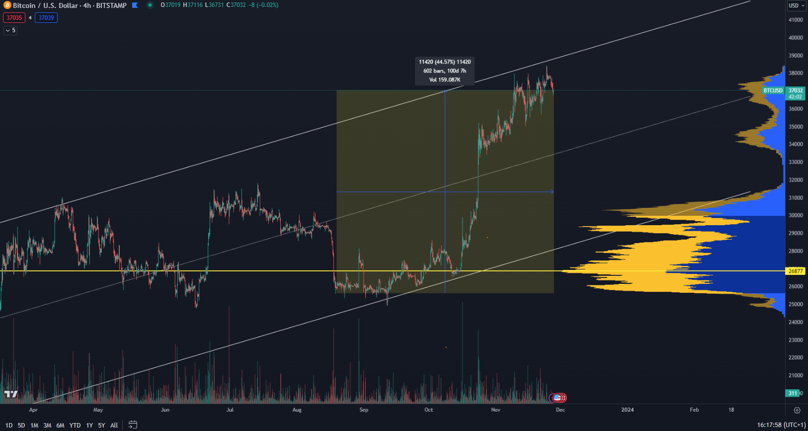 Podľa údajov z TradingView rastie Bitcoin už 100 dní. Posledná korekcia nastala v strede augusta 2023, keď sa cena prepadla len za 3 dni o približne 13 %. Až do polovice októbra cena najväčšej kryptomeny na svete rástla len mierne, no potom sme boli svedkami prudkého zhodnotenia. No čím dlhšie cena rastie, tým viac sa zvyšuje šanca na korekciu.