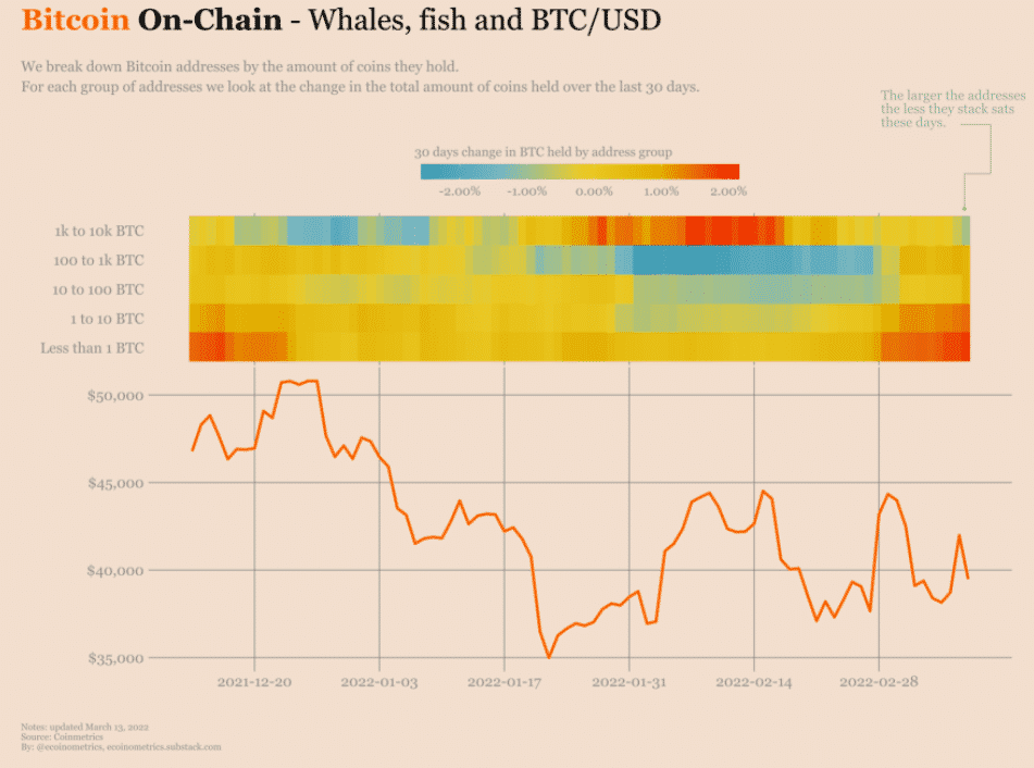 Zdroj údajov Ecoinometrics vo svojej najnovšej týždennej správe poskytol dôkaz o rozdiele v dopyte medzi malými a bohatými investormi. Napríklad poznamenal, že adresy, ktoré obsahujú až 10 BTC, hromadili mince za posledných 30 dní. Naopak, tie, ktoré držia viac ako 10 BTC, ich distribuujú.
