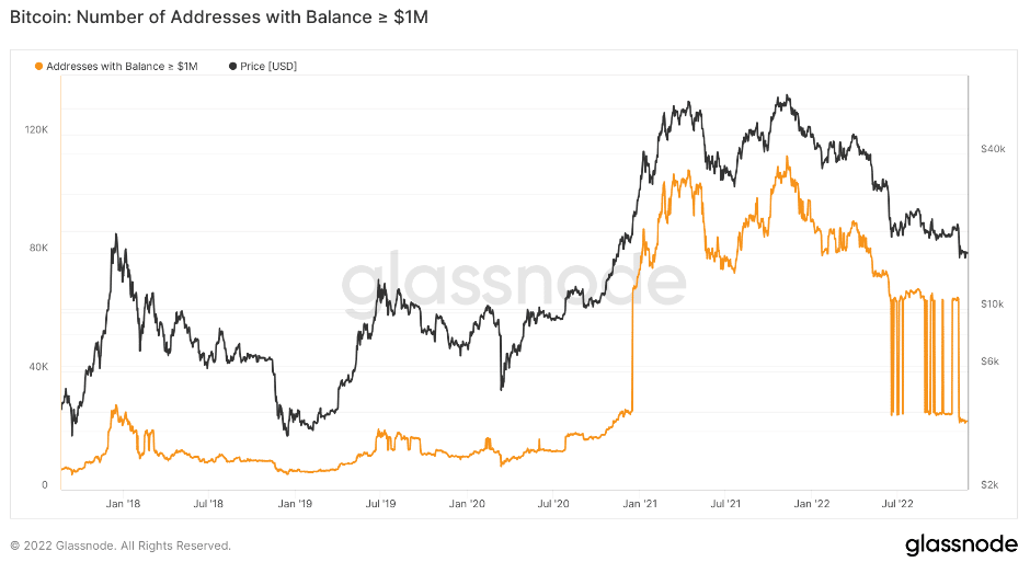 Vo všeobecnosti je tak preukázateľné, že počet milionárskych peňaženiek klesal na základe poklesu spotovej ceny Bitcoinu. Od nedávneho krachu kryptomenovej burzy FTX sa však situácia začína v prípade BTC pomaly stabilizovať. Niektoré triedy peňaženiek pomaly začínajú hromadiť BTC.