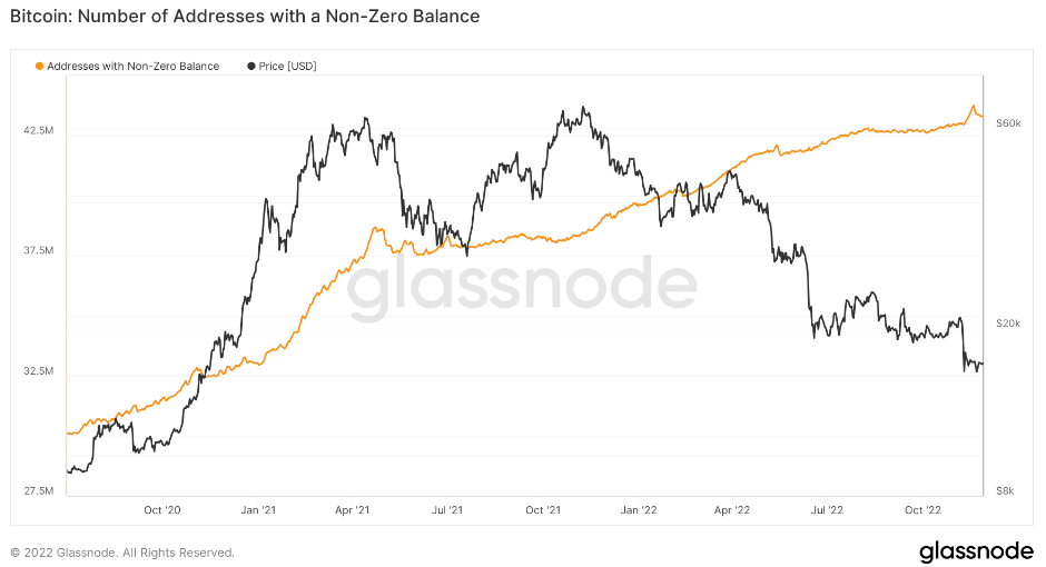 Absolútny rekord bol zaznamenaný v prípade peňaženiek, ktoré držia 1 a viac BTC. Ich počet dosiahol 27. novembra 952 000. Okrem toho vzrástol aj počet peňaženiek, ktoré vlastnia od 0,01 BTC. Adresy s nenulovým zostatkom od 18. novembra klesajú, a to môže naznačovať zlom. Takýto stav bol naposledy zaznamenaný ešte v apríli 2021.
