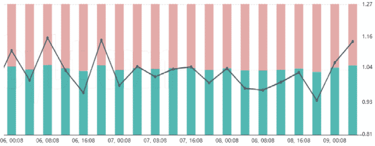 Z hľadiska futures trhov, môžeme vidieť, že traderi taktiež vsádzajú skôr na longové pozície. Údaje z Bybt ukazujú pozície od najlepších obchodníkov na burzách Binance, OKEx a Huobi. Aktuálny ukazovateľ 1,14 vsádza na longy o viac ako 14 %.