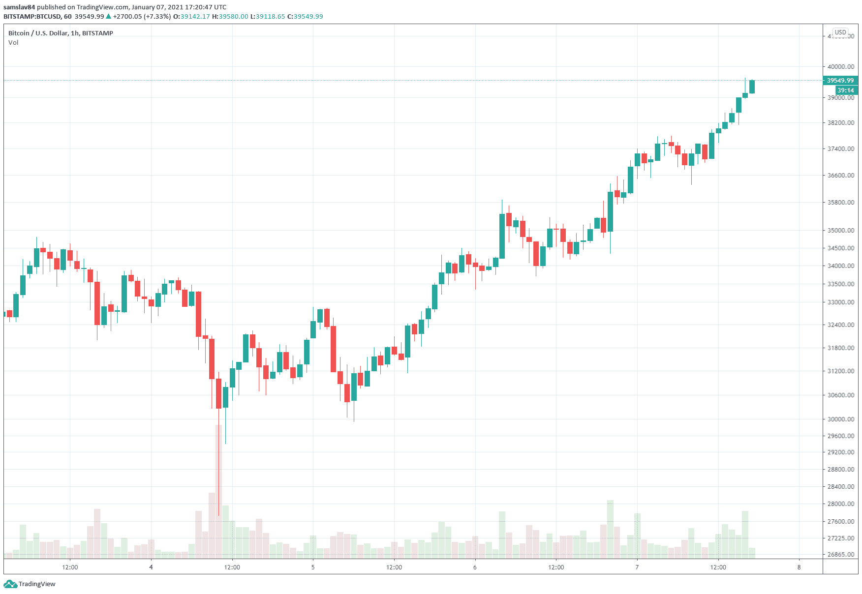 Bitcoin rekordných sedem hodín po sebe vytvára nové a nové cenové historické maximá. Zatiaľ čo ráno sa obchodoval za 37 500 $, teraz je už o dve tisícky vyššie. Pred chvíľou dokonca takmer otestoval 40 000 $. Ako môžete vidieť na hodinovom grafe, nakoniec sa zastavil na 39 630 $ (burza Bitstamp). Chýbajú mu už iba štyri stovky!