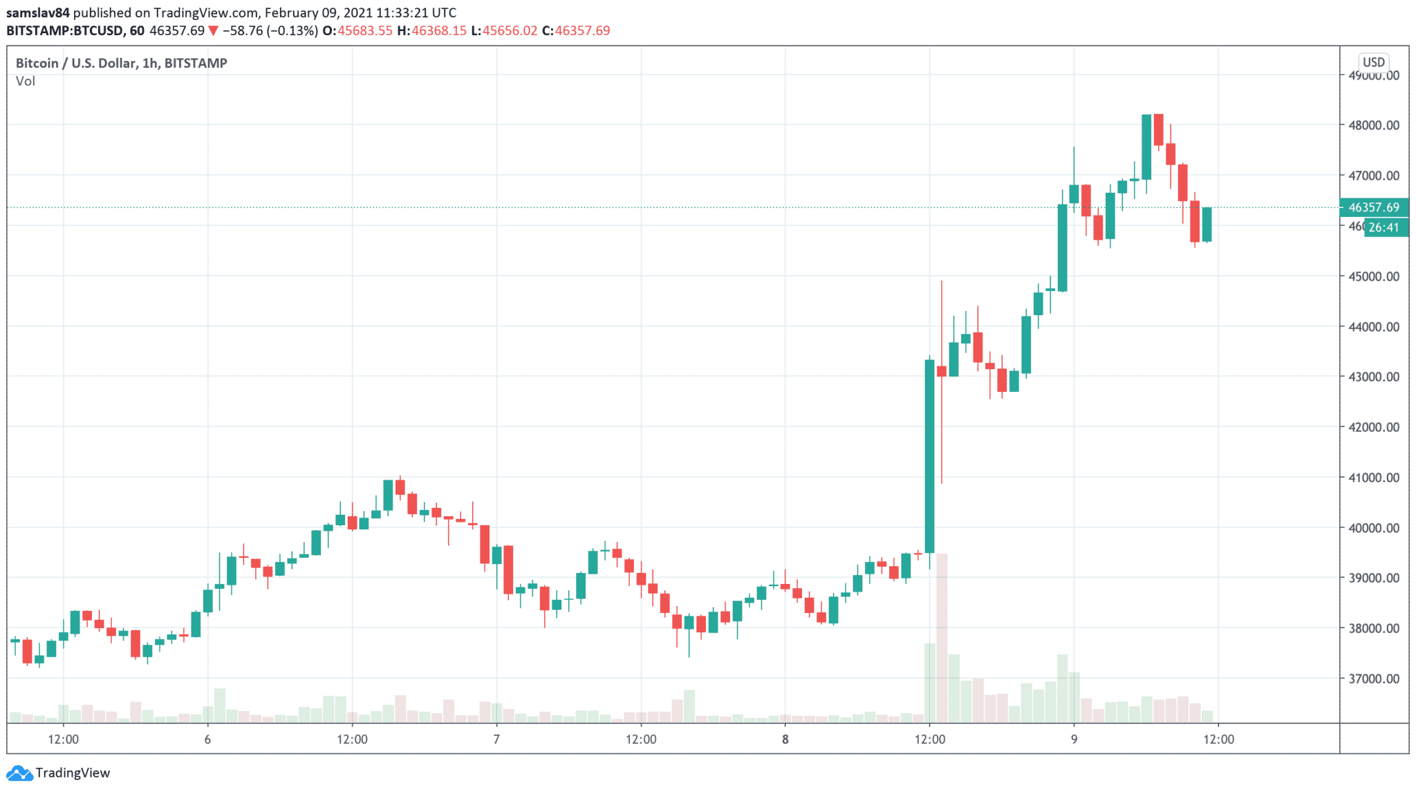 Kapitalizácia Bitcoinu včeraq prekonala Teslu po tom, čo výrobca elektrických áut ohlásil nákup za $1,5 miliardy a plány na prijímanie platieb v BTC. Splnil sa tak mokrý sen fanúšikov kryptomien a technológií, ktorí už dlho Elona nahovárali, aby niečo kúpil. Fakt, že najbohatší človek na svete má prsty v Bitcoine je extrémne bullish pre celý trh a vidno to aj na cene. Tá by mohla čoskoro dosiahnuť magickú hladinu 50 000 $. Sme naozaj veľmi blízko!