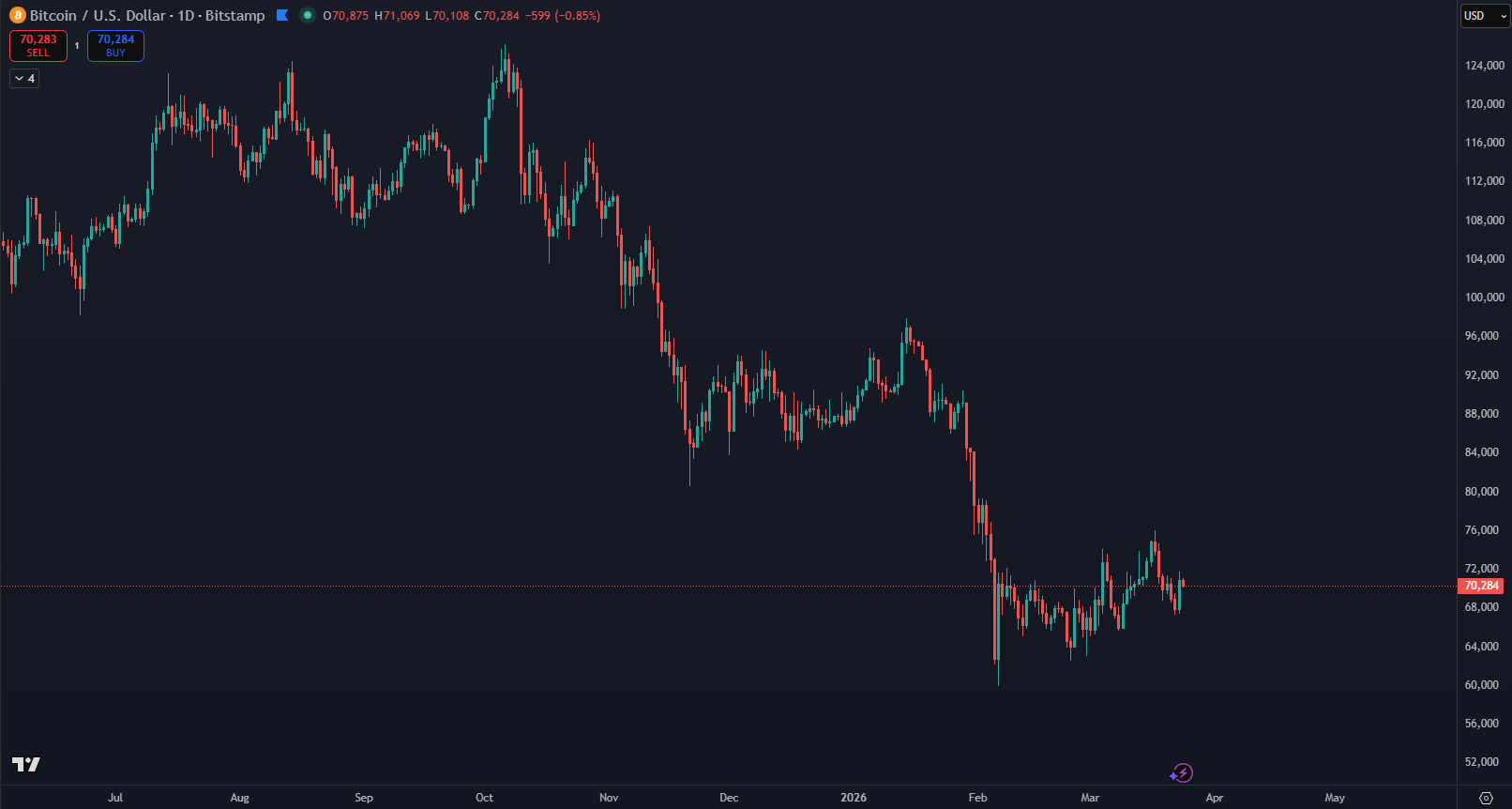 Od októbra 2025 až do marca súčasného roka sa cena najznámejšej kryptomeny nachádza v klesajúcom trende. Tento stav výrazne podporilo vysoké znižovanie pákového efektu na trhoch. Od veľkého kryptomenového pádu, ktorý nastal 11. októbra 2025, klesla hodnota vlajkovej mince o viac ako 45 %. V čase písania tohto textu sa jedna minca obchoduje na úrovni približne 70 180 dolárov, ukazujú údaje TradingView.